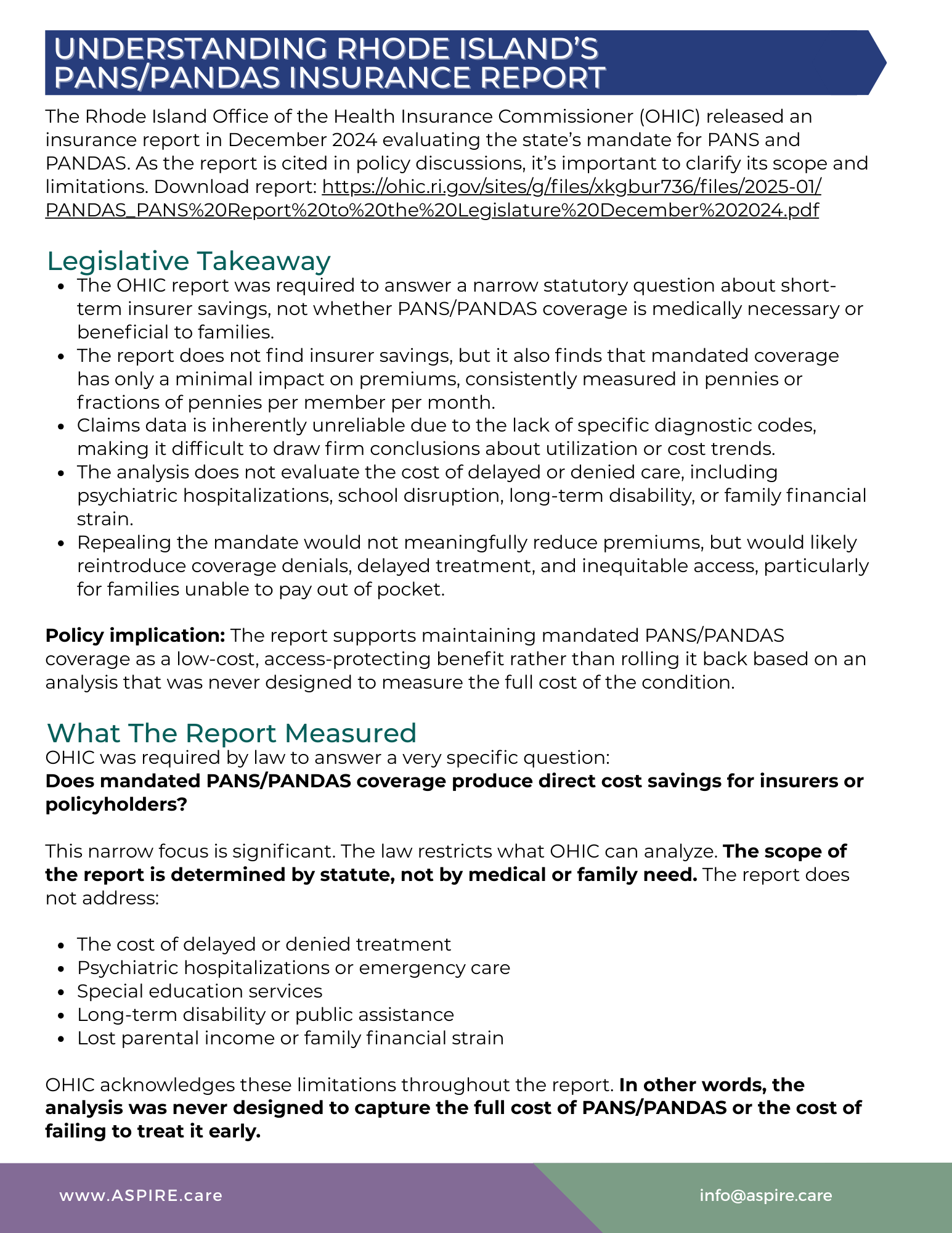 In December 2024, the Rhode Island Office of the Health Insurance Commissioner (OHIC) released a report evaluating the state’s insurance mandate for PANS and PANDAS. As this report is cited in policy discussions, it is important to clarify its scope and limitations.