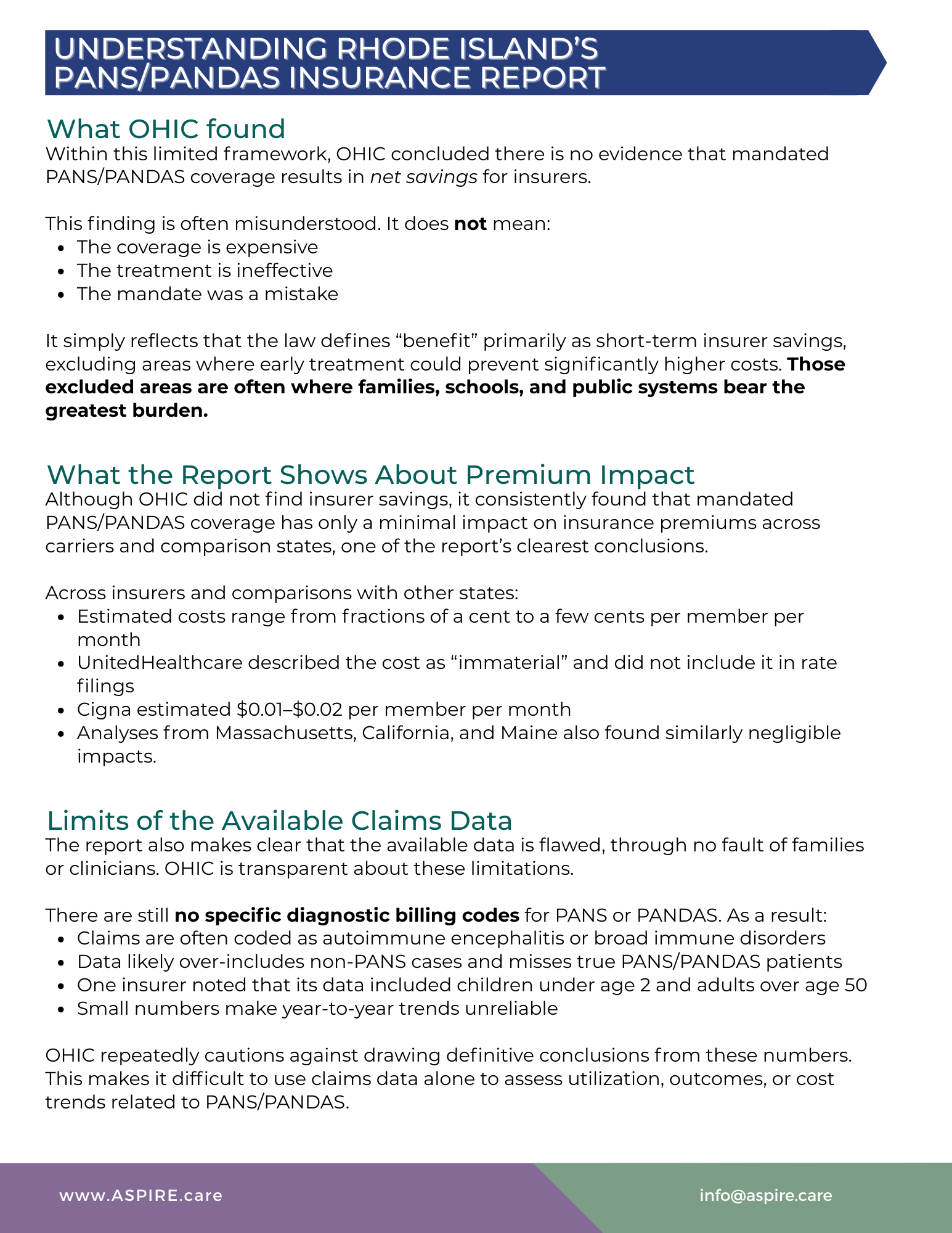Although OHIC did not find insurer savings, it consistently found that mandated PANS/PANDAS coverage has only a minimal impact on insurance premiums across carriers and comparison states, one of the report’s clearest conclusions.
