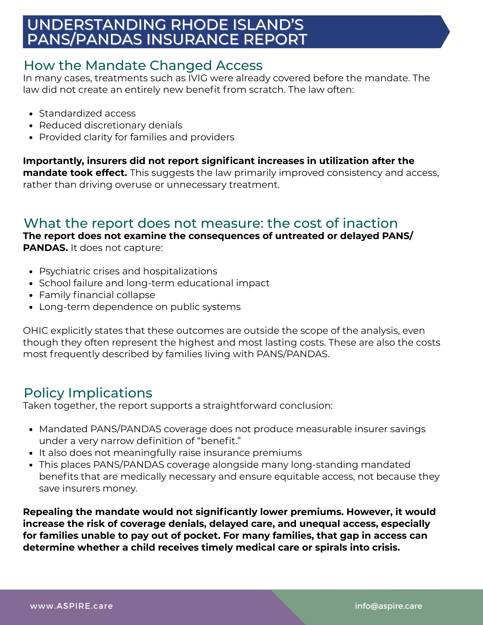 Policy implication: The report supports maintaining mandated PANS/PANDAS coverage as a low-cost, access-protecting benefit rather than rolling it back based on an analysis that was never designed to measure the full cost of the condition.