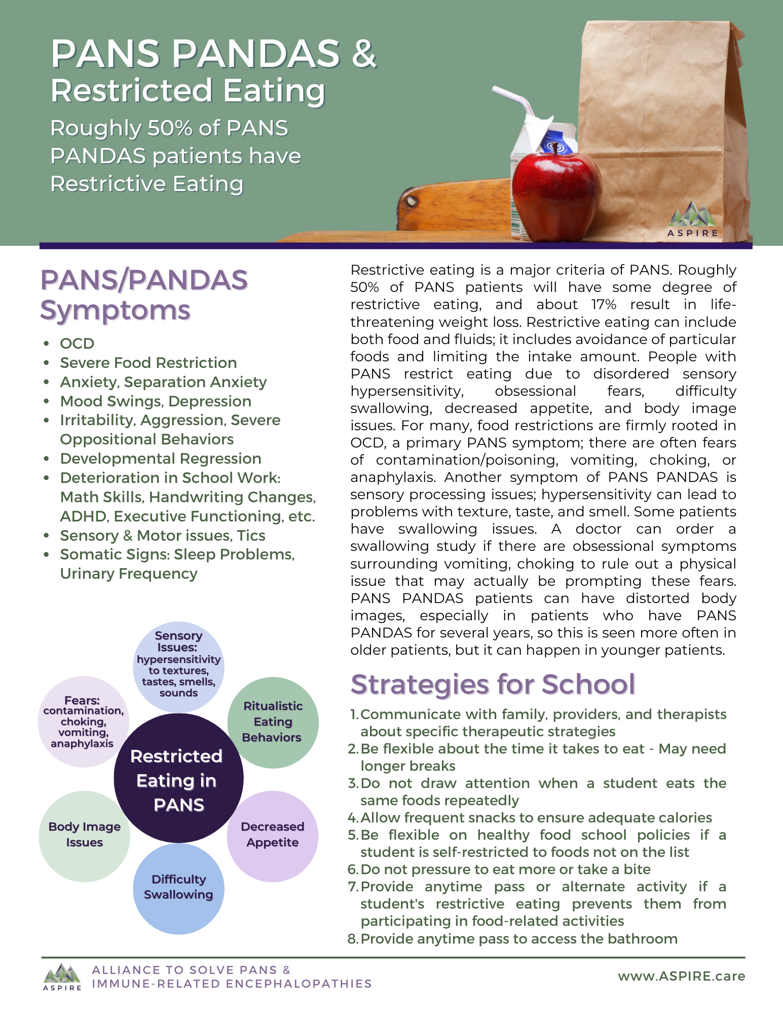 ASPIRE has two additional PANS & Restricted Eating Handouts. One is a general information handout that can also be downloaded as a poster. The second handout is Restrictive Eating in School. Please see the end of this article to download those.